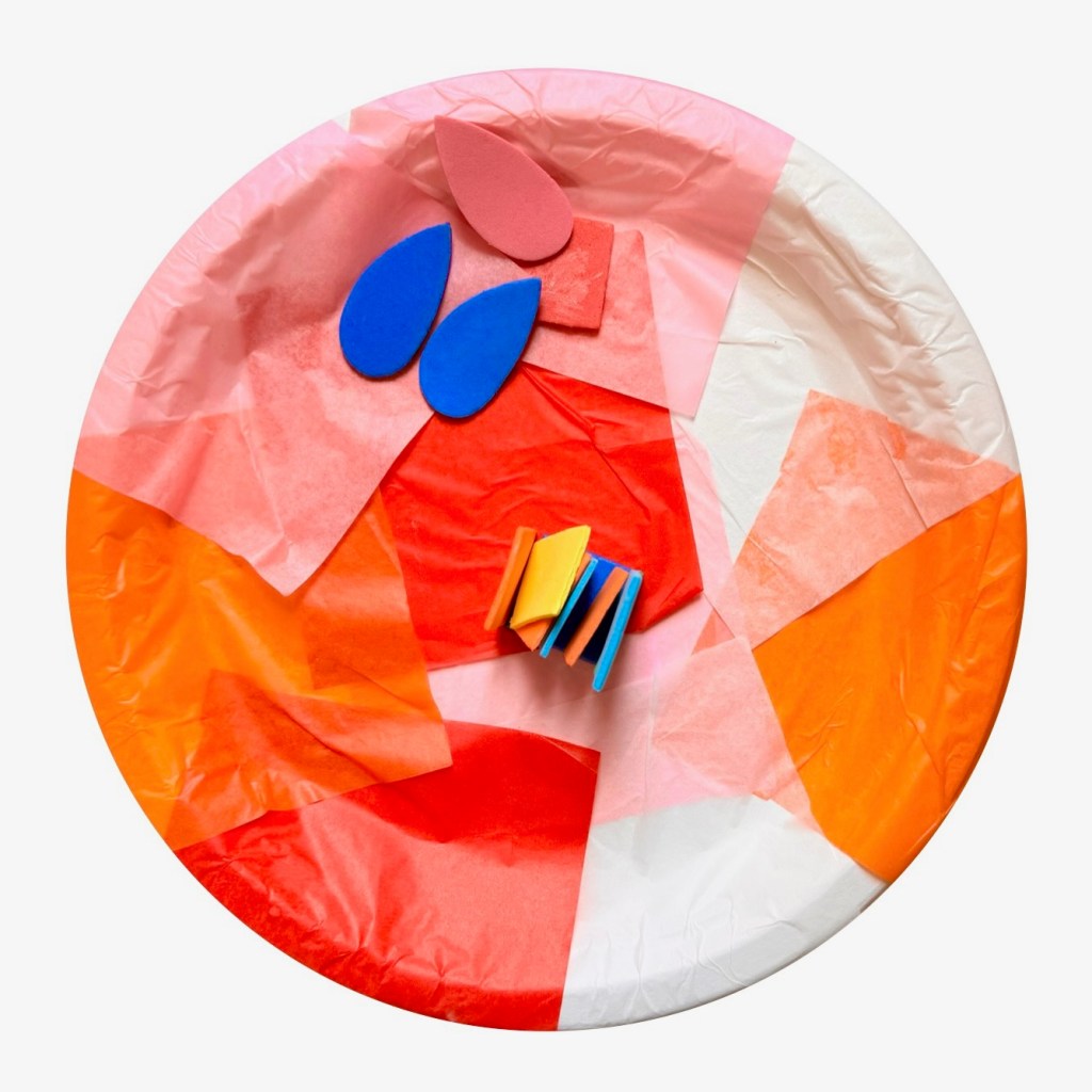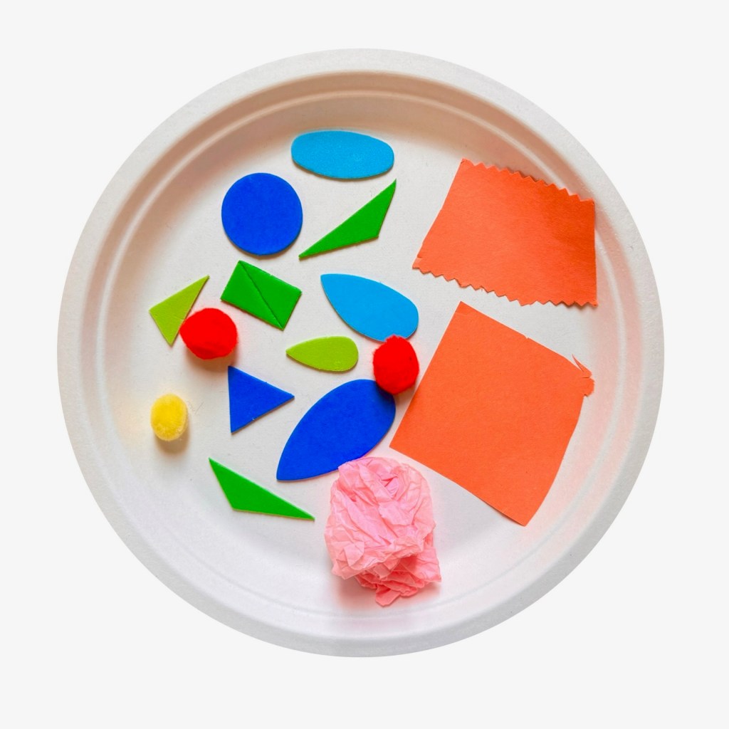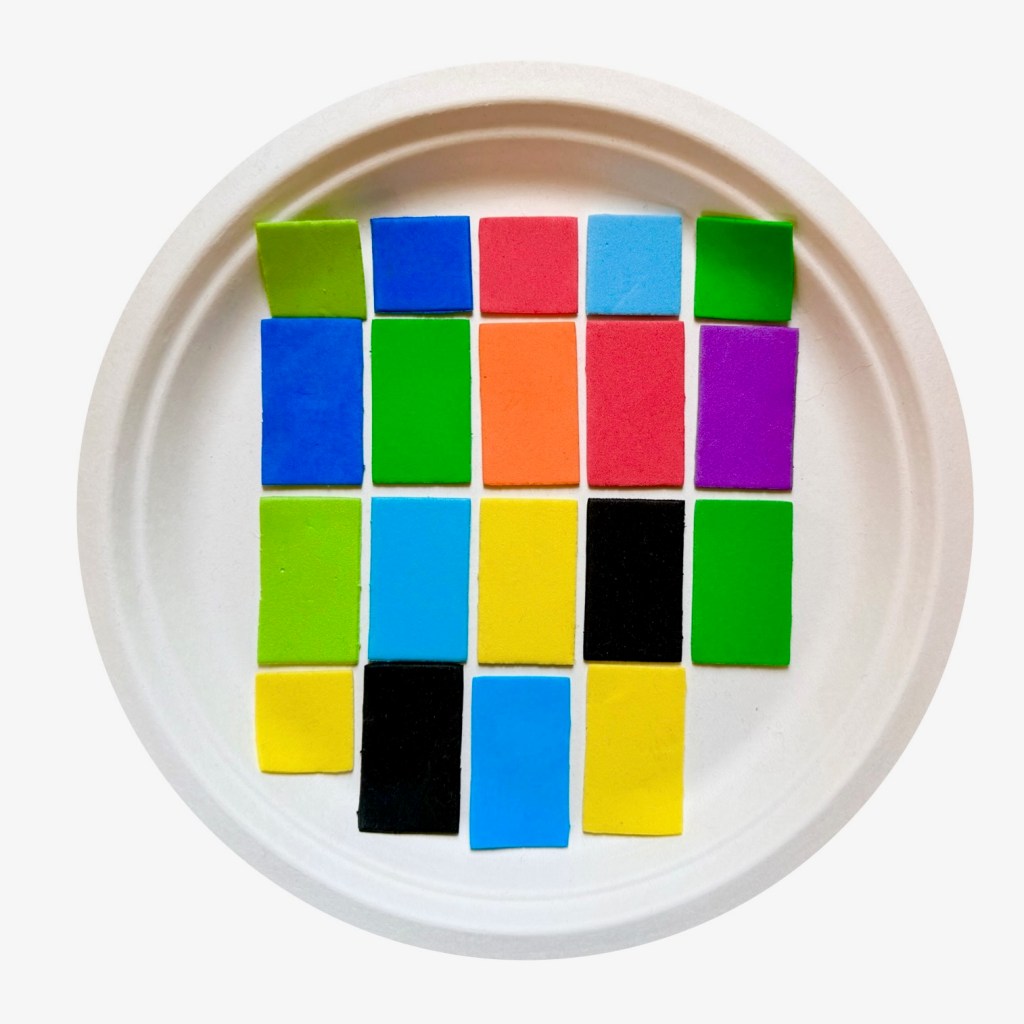 - One plate features an array of colorful geometric shapes, including circles, triangles, and squares. The vibrant hues of blue, green, red, and yellow create a lively composition that explores the interplay of primary and secondary colors. The use of soft and hard textures, like pom-poms and cut-out shapes, adds a tactile dimension to the artwork.