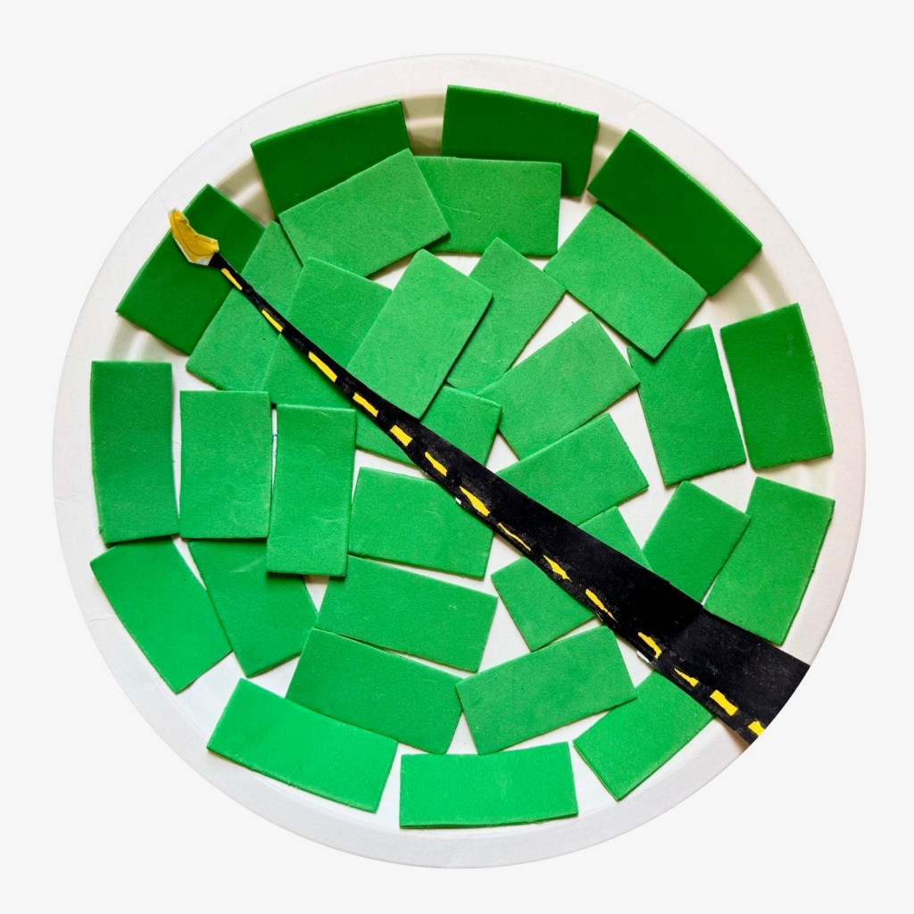 - In a different creation, students experimented with lines and movement. Black pom-poms arranged in a curving line against a background of green and yellow shapes demonstrate how lines can guide the viewer’s eye and suggest motion. This piece teaches the importance of line as a fundamental element of art that can convey energy and direction.