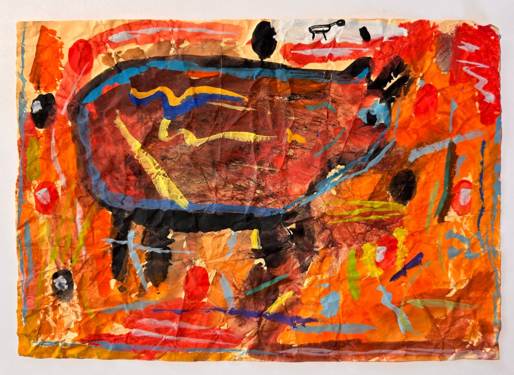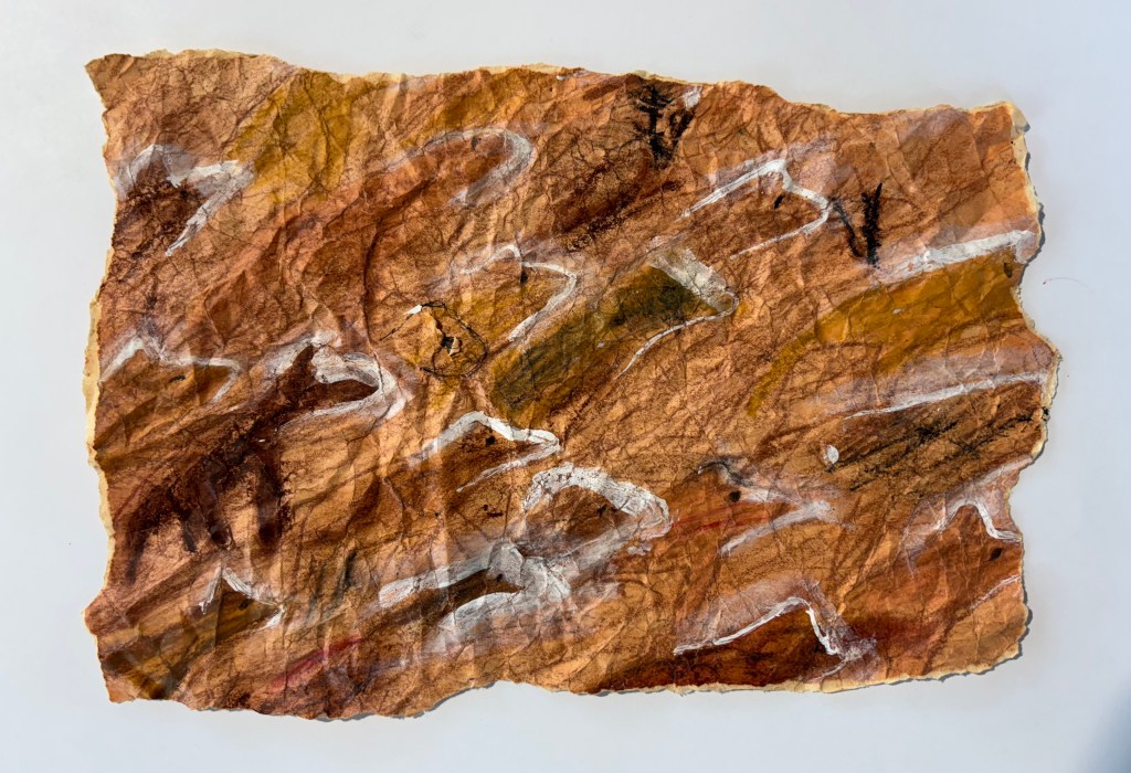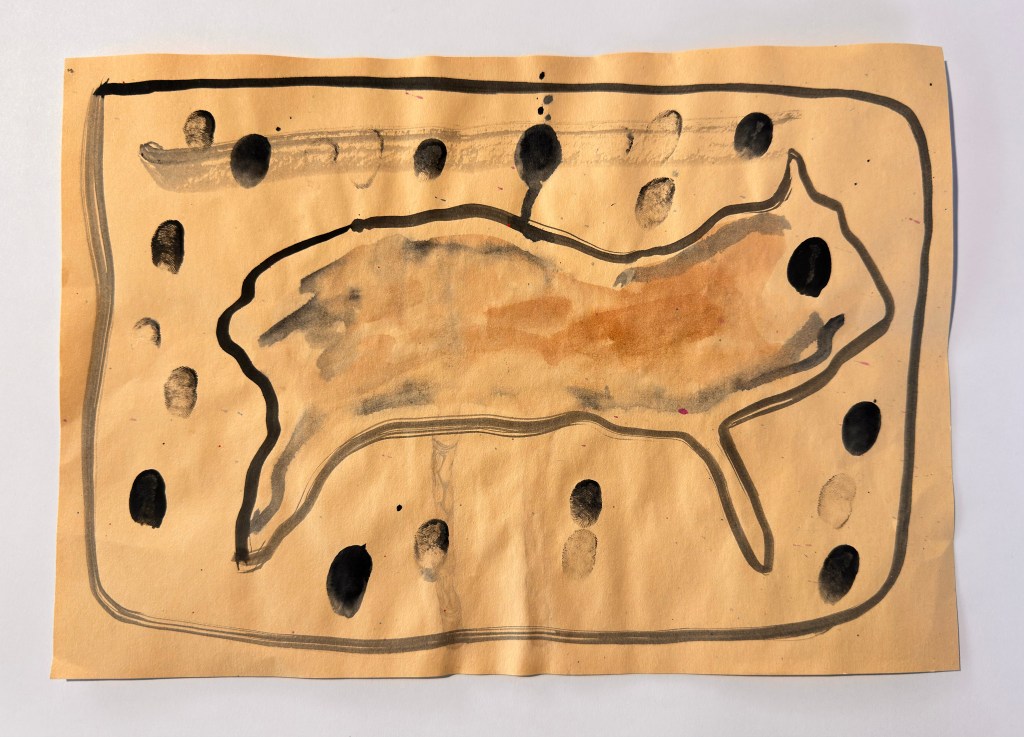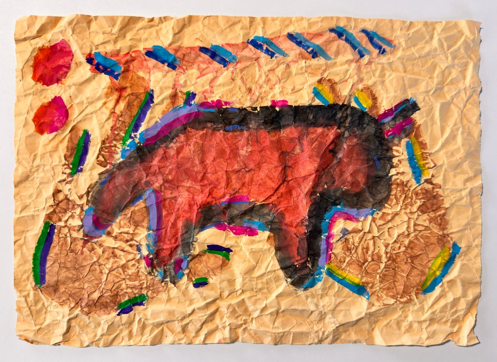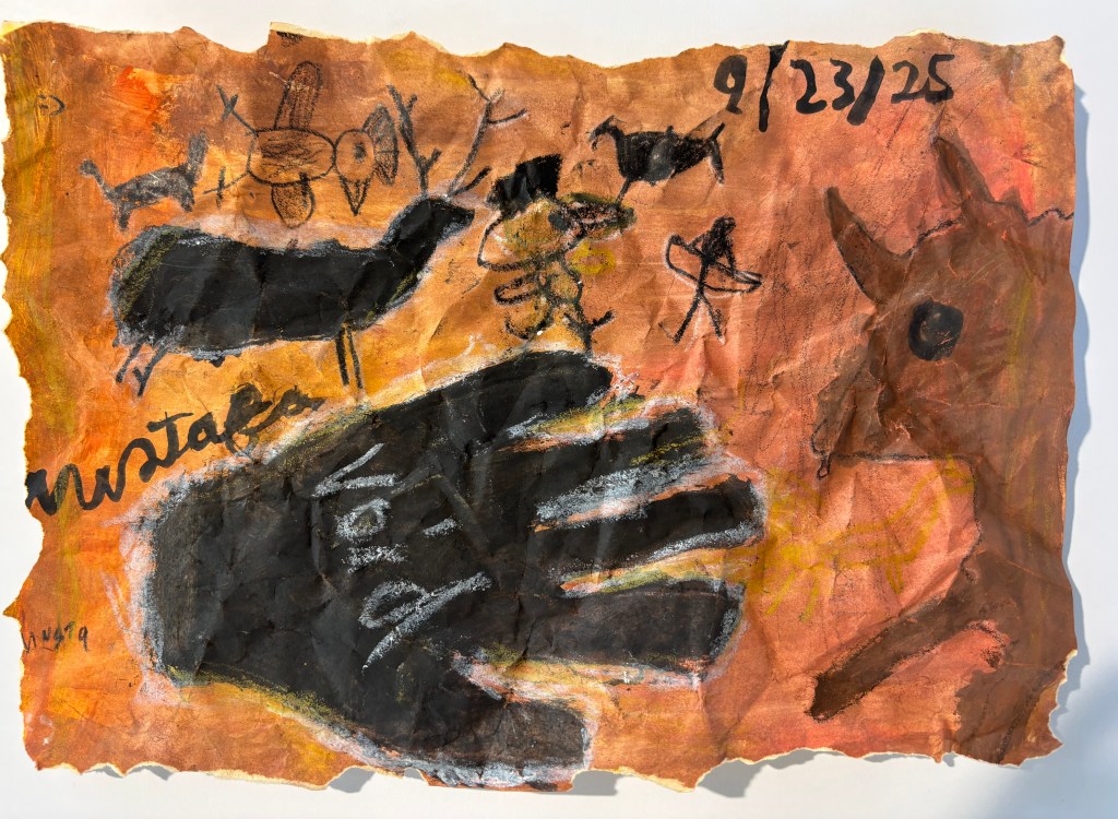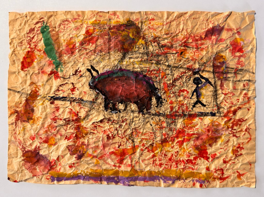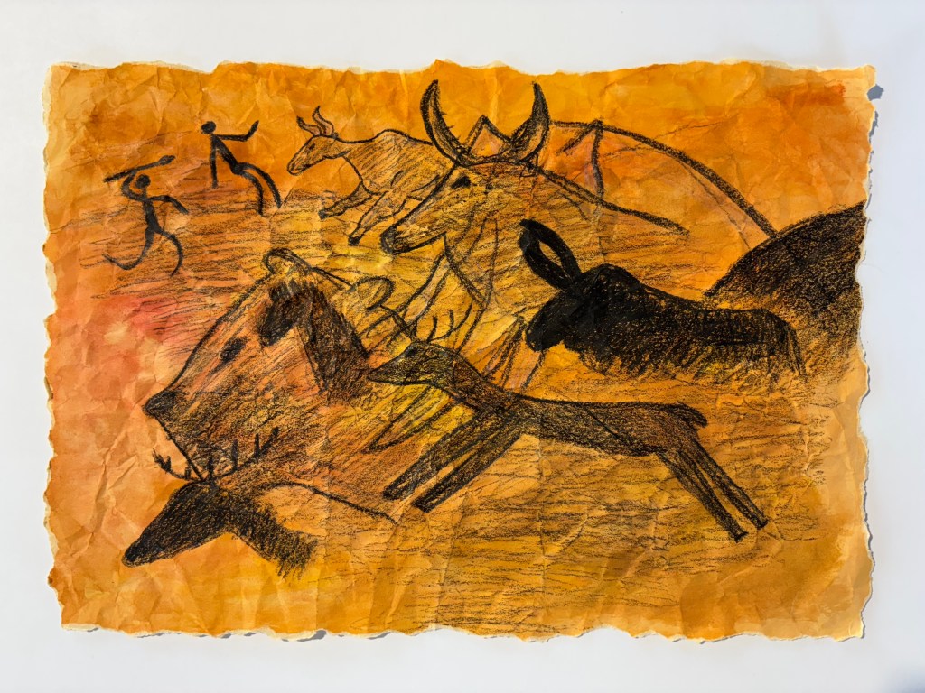 Our sixth graders stepped deep into prehistory, back to the flickering firelight of ancient caves, where the first artists told stories through pigment and motion. Using wrinkled paper as “stone,” they worked with earthy ochres, umbers, and reds to evoke the primal atmosphere of sites like Lascaux and Altamira. But this was not mere imitation, t was reinvention.