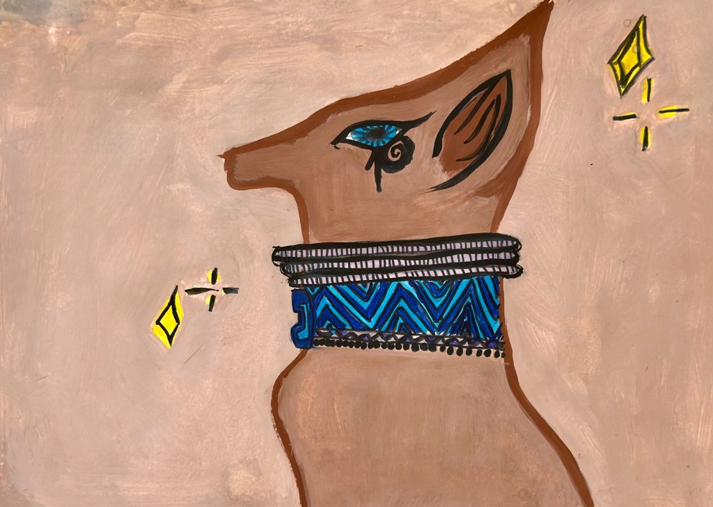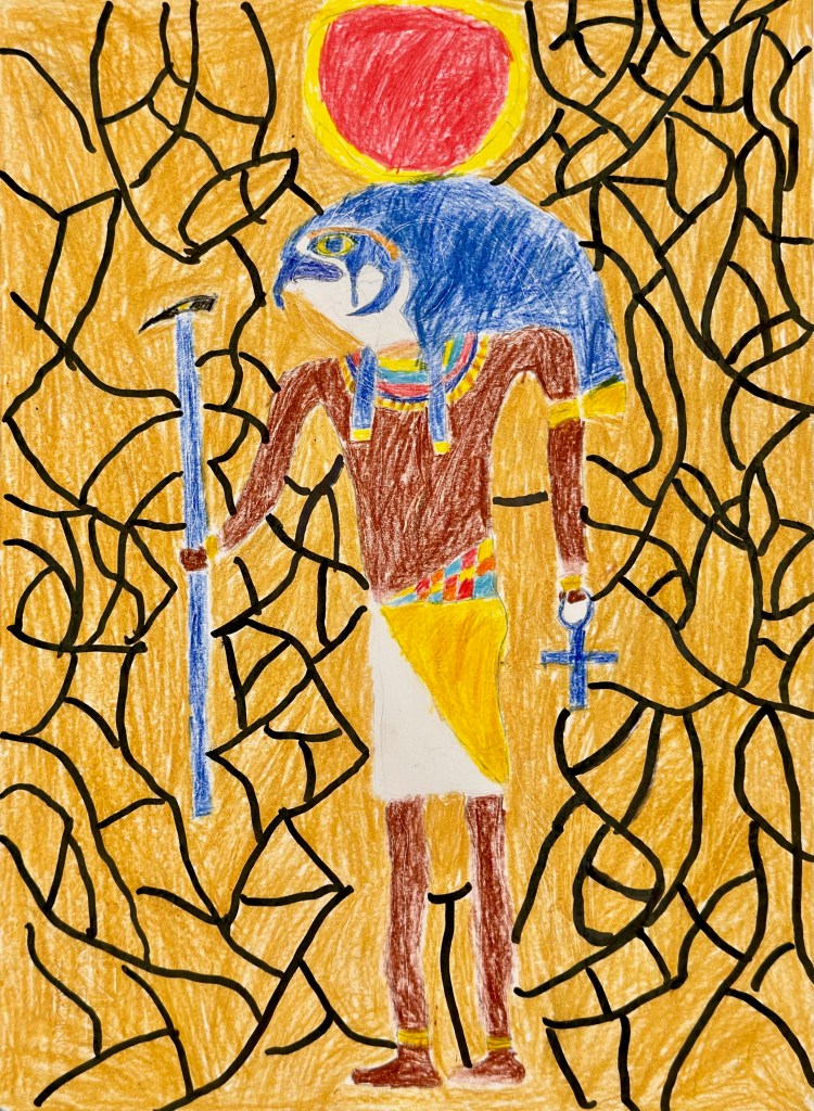 Students began by researching the Egyptian deity they chose to transform. They studied the god’s traditional symbols, colours, powers, responsibilities, and the objects that have always accompanied them in temple reliefs and funerary art.