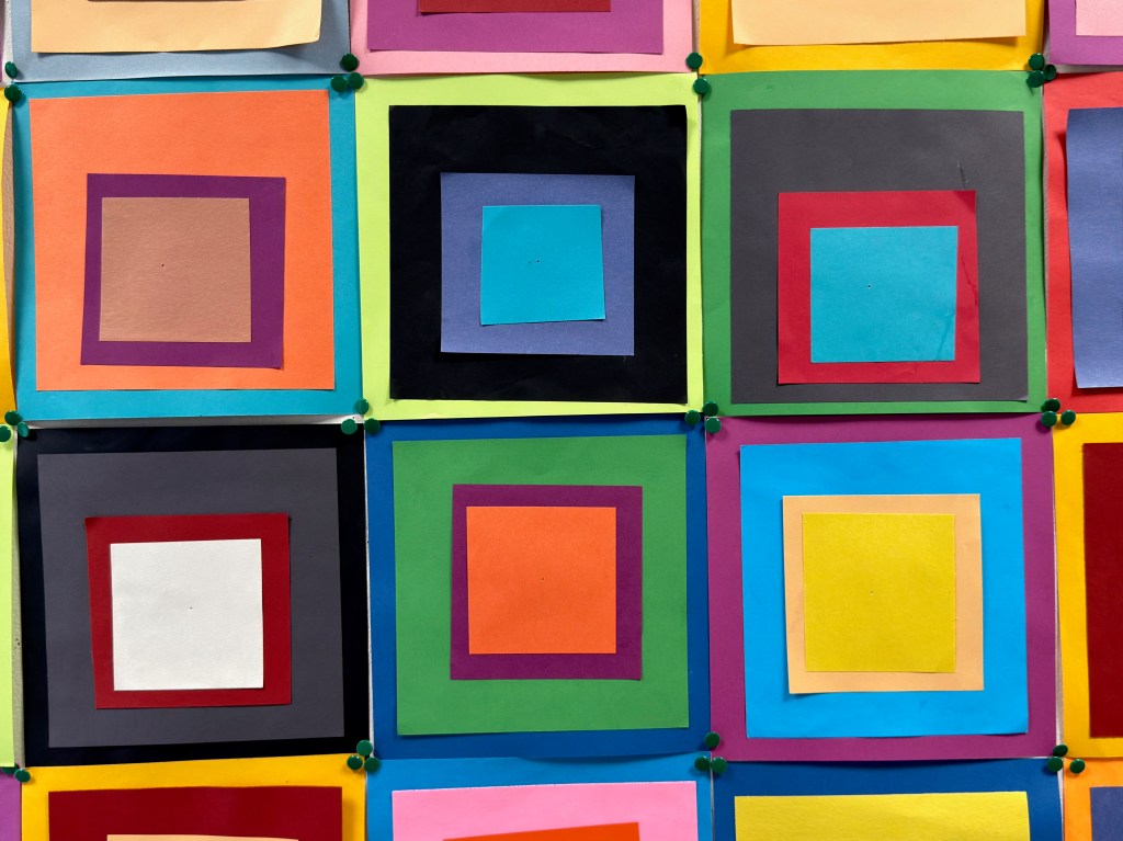 Students studied Albers’ work and stepped into his methods, cutting and layering paper squares to test how one color behaves when placed inside another. What appears simple is actually a rich act of perception: students were learning to see like artists, noticing the delicate shifts that occur when warm sits against cool, when bright buzzes beside muted, when complementary colors spark.