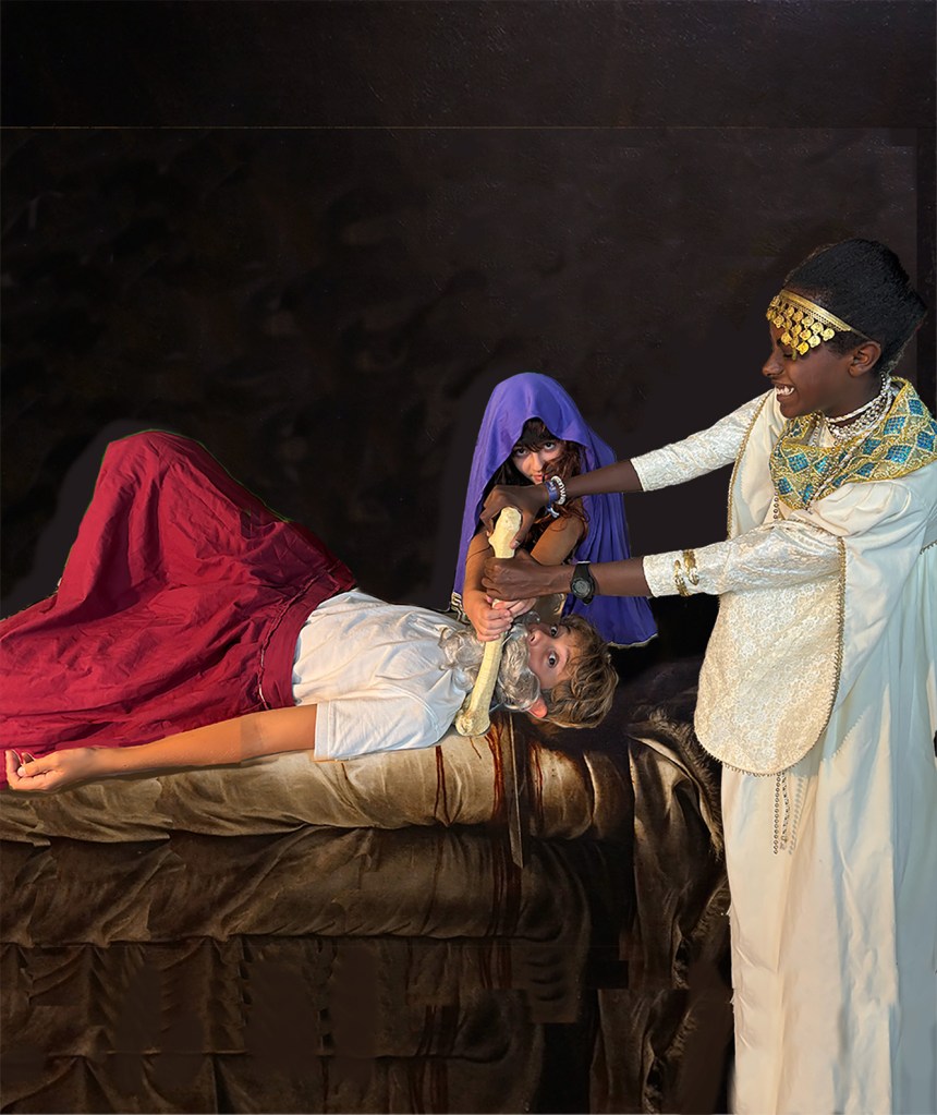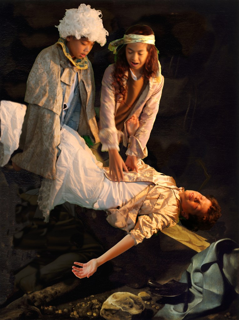 After studying Baroque artists such as Caravaggio, Gentileschi and Velázquez, students examined how these painters used strong contrasts of light and shadow, expressive poses, and detailed composition to create powerful scenes. In small groups, students analyzed a chosen artwork, then recreated the painting using costumes, props, and staged lighting.